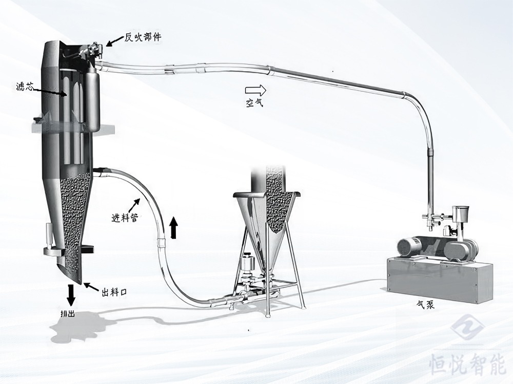 由射頻發(fā)生器產(chǎn)生真空即負(fù)壓即真空狀態(tài),通過吸料管從儲料桶中將物料吸入料倉內(nèi),物料隨同空氣吸入上料口形成混合氣流,在料倉內(nèi)進(jìn)行空氣與物料分離,分離出來的物料通過下料口進(jìn)入包裝機(jī)料倉,反沖裝置將吸附在過濾器上的物料清除再次進(jìn)入真空吸料機(jī)料倉。